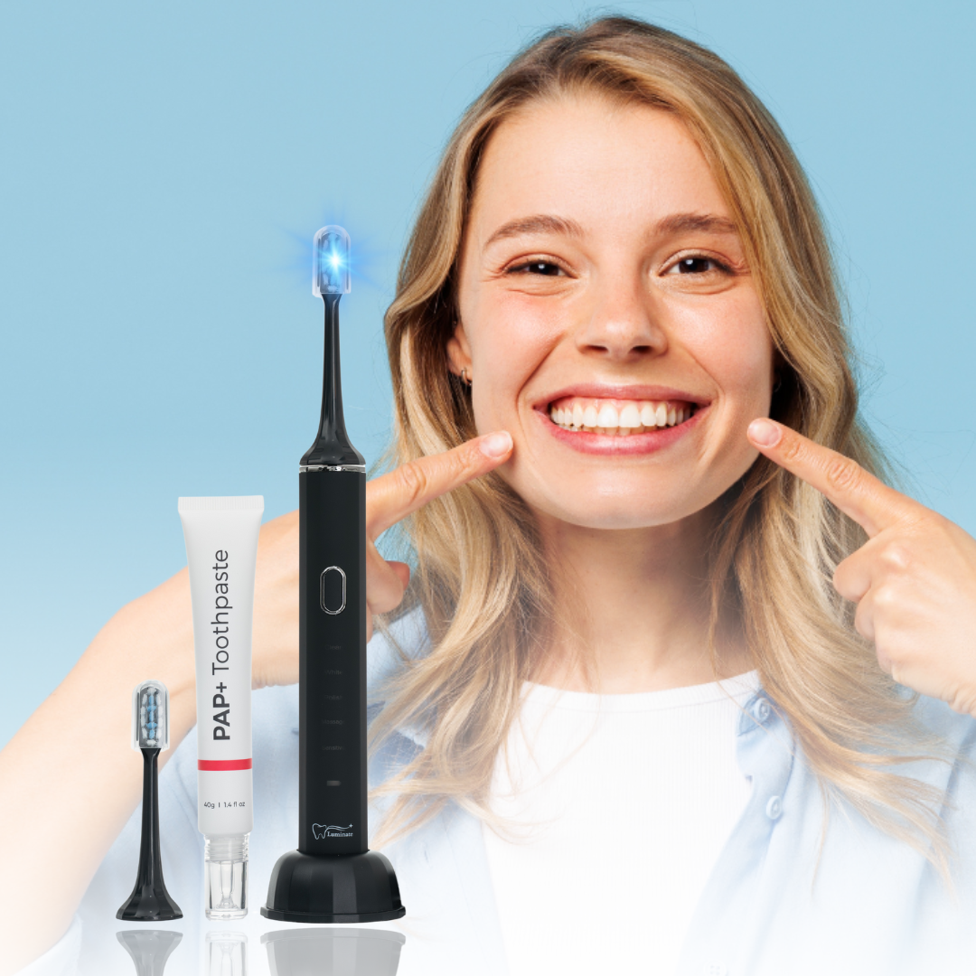 Combining the use of PAP+ teeth whitening toothpaste with our blue-light LED toothbrush accelerates the whitening process, effectively removing surface stains on your teeth for a swift and radiant whitening experience.